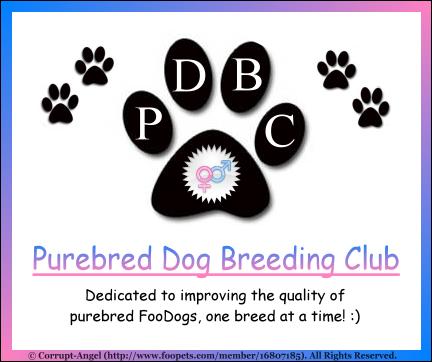 Welcome to the Purebred Dog Breeding Club (PDBC)! As the title should imply, our vision for this club is to strengthen and improve the quality of FooDog bloodlines for each individual breed. This requires that all members of the club only breed their dogs with the same breed. We set our stats expectations high so that we will be breeding only the best quality. Periodically, our officers will check your dogs and make sure they are well taken care of. If we happen to notice that you are neglecting your dog, the officers will have a discussion about your removal from the club. If you are interested in becoming a member of the club, please take the time to look over the rules, below. After you read and understand the rules, please fill out the form, and if you are accepted, you will receive a message on your profile. From the officers and the club, we welcome you. :)